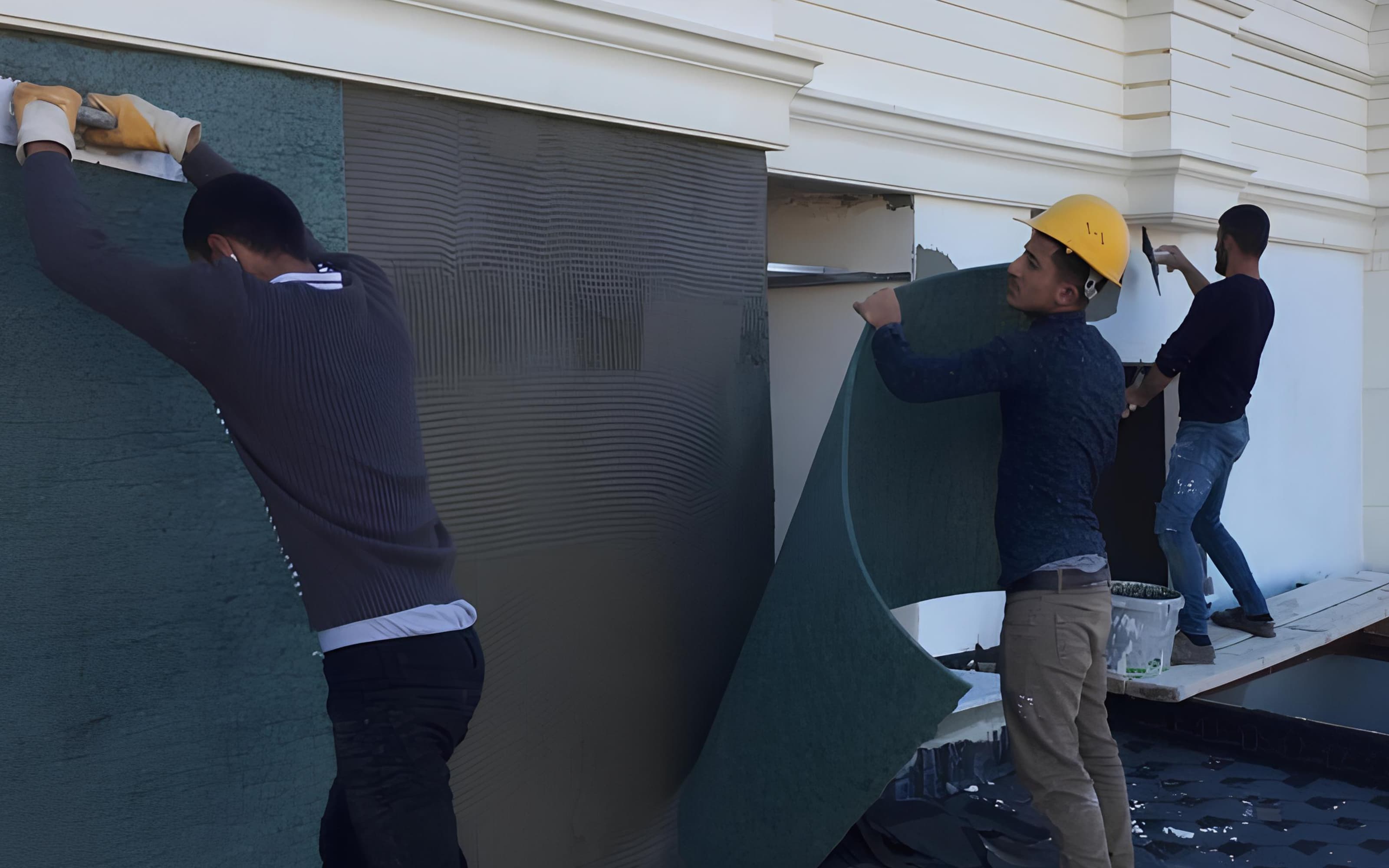 YÜZEY HAZIRLIĞI:Öncelikle kaplama yapılacak Dış cephe yüzeylerinde; kabaran sıvaların patlatılması, dökülen yerlerin sıva ile dolgulandırılması, Kolon, perde gibi yüzeylerdeki patlama yapan yerlerin temizlenmesi, yıkanıp, çimento harçlı malzeme ile doldurulması, eğimli yüzeylerin düzeltilmesi, kabaran boya yüzlerinin raspalanarak iyi bir alt zemin elde edilmesi sağlanır. Son olarak tüm dış cephe yüzeyleri temizlenip kurumaya bırakılır. Alt zeminin uygulamaya hazırlanmasına mütakip; kaplama yapılacak yüzeylere bina en üst noktasından başlayarak aşağıya doğru yekpare yapıştırarak devam edilir.